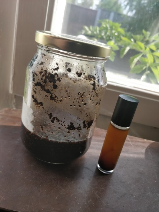 Blanda en matsked avokadoolja med kaffeoljan du nyss pressat. Häll upp i en liten flaska, gärna en sådan med en roller på. Denna sats räcker till mer än en flaska, men om du vill kan du förvara det du inte använder direkt i en burk i kylskåpet.